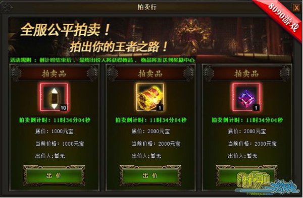 天局中的拍卖行,里面的拍卖品不是每天都换的,每天的东西都是一样的呢,不过其实这些东西是非常赚的呢,就像是那10块神兵碎片,1000元宝不一定能够获得10片的呢,有的时候就差这10片,那个时候就可以来拍卖行排下这个啦。黄金宝箱这个东西是随机开出一件传说的神武装备,不过这个职业可不固定哦,开到哪一个职业就是哪一个职业了呢,不过不是绑定的,可以去卖掉赚钱哦。总体来说不会亏本就是了。