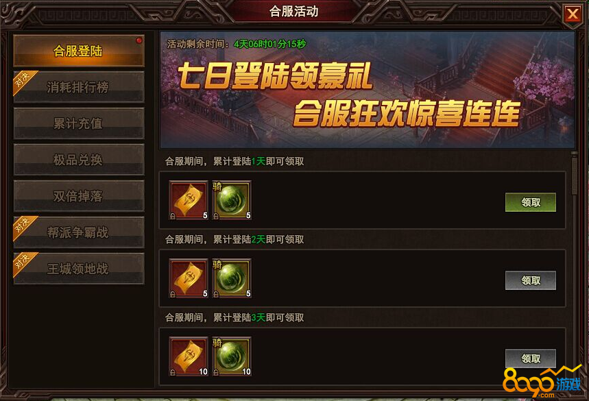 累计登陆5天:装备兑换券*15、坐骑进阶丹*10;