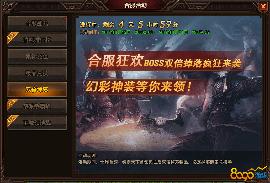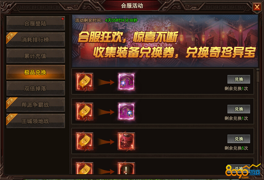 活动内容:合服7日狂欢必定掉落装备兑换券