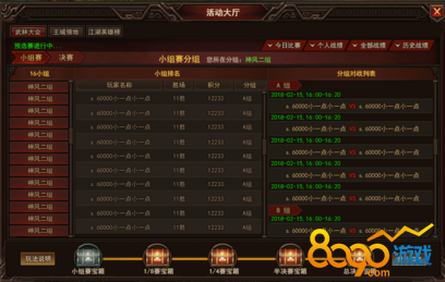 将跨服天梯排名前256名的玩家随机分成16个小组,小组的优胜者即即为16强,具有决赛参赛资格,每个小组间进行小组赛,每人需与其他玩家一一对战,打满7场比赛,最终以胜利场次进行排名,胜利场次相同则积分高者进入决赛。
