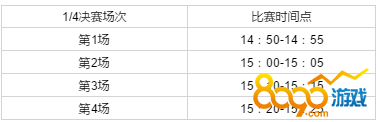 每月11号下午14:40-15:40为1/4决赛时间,第一场比赛前10分钟为准备时间,每场比赛5分钟,间隔5分钟