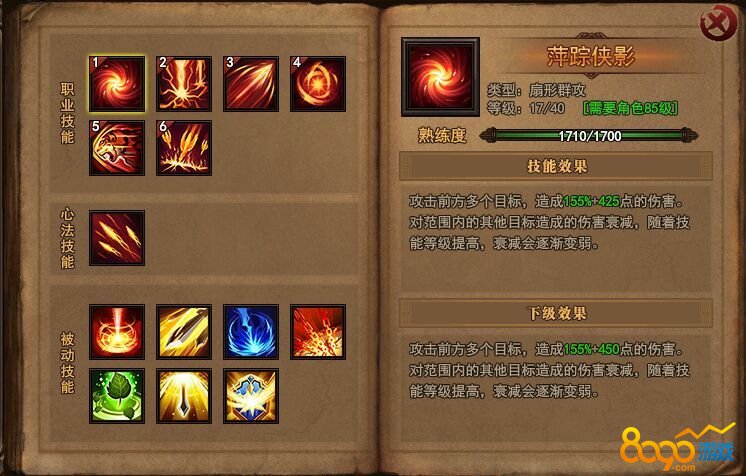 作为初始技能,萍踪侠影在发动的时候是以扇形效果进行群体攻击,可以同时攻击前面的多个目标,造成155%加100点伤害,对范围内的其他目标造成伤害衰减。当我们这个技能得到了一定的等级提升之后,衰减就会持续变弱,所以当大家有了足够的金币之后,一定要优先把这个技能进行升级。