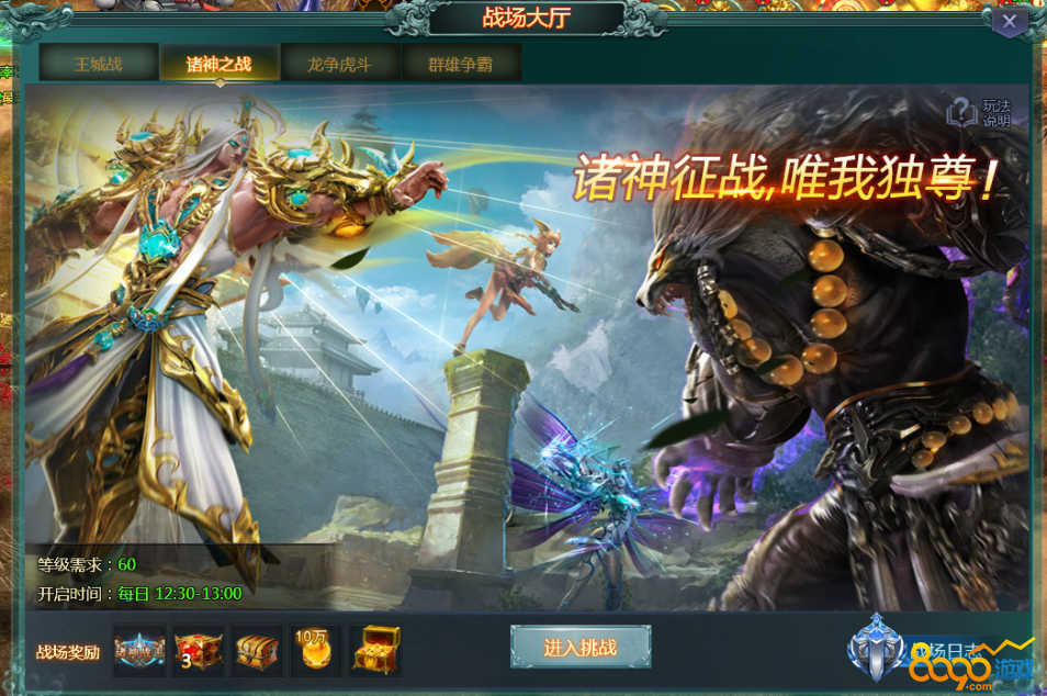 搜索"8090网页游戏"8090《天骄无双》中诸神之战玩法,玩家可以在游戏主界面战场大厅进入诸神之战。活动开启时间为每天12:30-13:00。