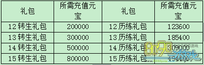 活动内容:活动期间玩家只需充值对应元宝金额即可领取对应转生礼包