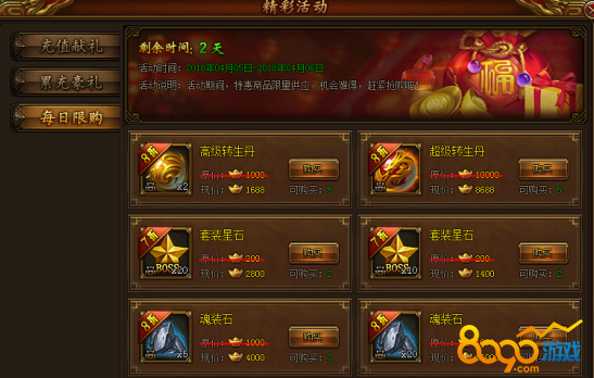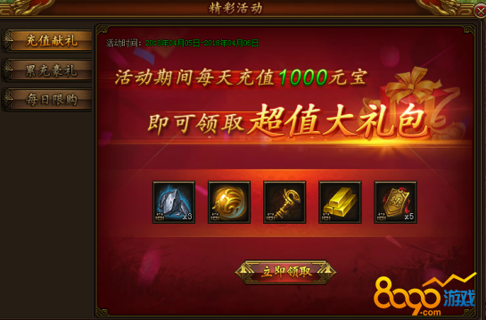 活动期间,每天充值1000元宝即可领取超值大礼包。