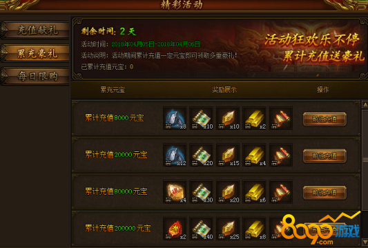 活动期间累计充值达到一定金额即可领取超值豪礼!