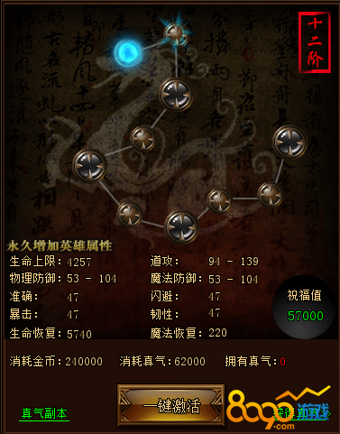 屠龙战神的英雄经脉分为多个大阶,每一阶又分为10个小节点,消耗英雄真气可以突破小节点,当10个节点都突破之后就可以进入下一个大阶。英雄技能的升级需要满足经脉要求,只有达到规定的经脉等级才可以升级技能。当消耗英雄真气突破经脉失败时,消耗真气的50%将转化为祝福值,当祝福值满10w即可领取等额的真气。