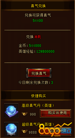 目前英雄真气的活动方式有3种,第1种是通关每日的真气副本,每天可以刷2次真气副本,第2种是直接在商城进行购买,第3种是通过消耗英雄的经验来兑换英雄真气,每个角色每天可以兑换3次。