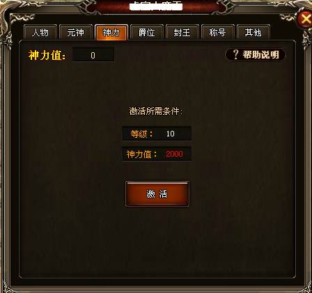 天魔神谭卡亚为勇士们带来神的翅膀,神力使者为勇士们带来神力的力量!打开人物界面(快捷键C),选择神力页签查看神力界面,满足条件即可开启神力附体状态