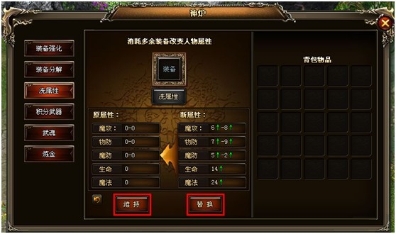 3、属性洗炼后,想保持原来属性,则点击【维持】,若想获得新属性,则点击【替换】