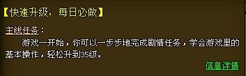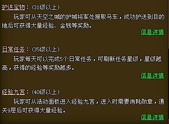 起初跟随主线任务升级,然后到了31级参加护送宝物任务,任务完成还有金钱的奖励哦,一些日常任务到了35级也可以做了,到了40级就可以挑战经验九宫格了。