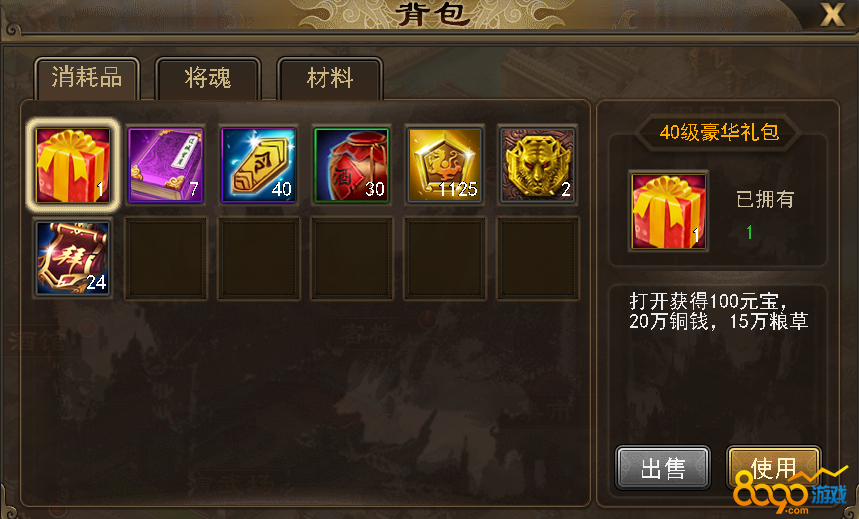 消耗品:包括等级奖励礼包、经验书、军团夺宝令牌、米酒、虎符、拜帖等等。