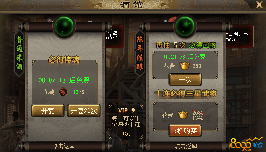 首先游戏有一个酒馆,在酒馆里可以使用美酒开宴席,宴席分为普通米酒和陈年佳酿,米酒可以直接消耗开席,佳酿就是使用元宝开席招募,两种都可以招募到武将或者武将将魂以及铜钱、经验书、各种材料奖励。武将将魂达到一定数量就可以直接激活武将。如果运气好说不定能直接抽奖招募到吕布哦,但是武将比较多,获得吕布的几率不高。