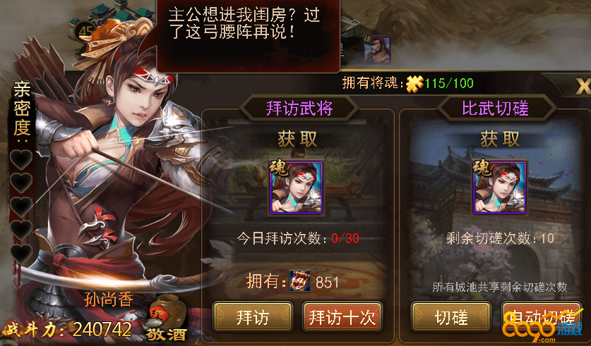17级开放切磋拜访系统,在世界地图上寻找到居住着武将的城池,即可在城池菜单中点击该武将头像进行切磋与拜访。