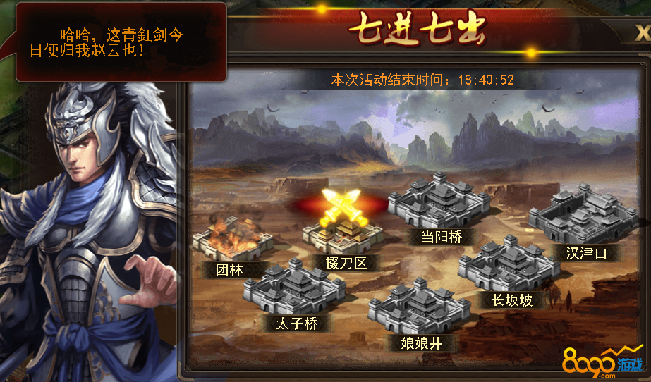 蜀传活动也有许多题材,比如这次的就是赵云七进七出的题材活动,活动是限时的,一定要关注好活动的时间。活动内容为七个战场,依次为团林、辍刀区、当阳桥、太子桥、娘娘井、长坂坡、汉京口,打完第一个战场获得胜利之后即可进行下一个战场,每进入一个战场。