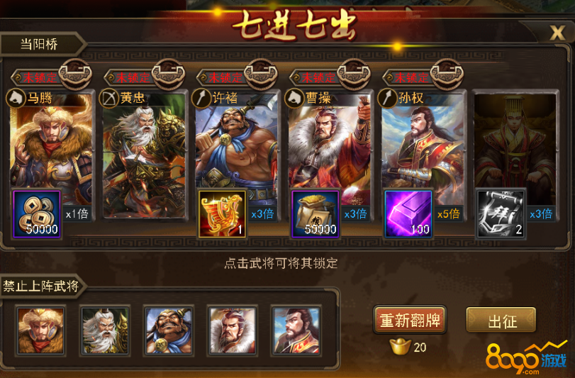 每个战场都需要翻牌子,翻6个,其中5个有奖励,有钱粮、铜雀令、陨铁、拜帖、训练材料等等奖励,每场战斗都会出现禁止上阵的武将,参加这个活动还是要兵多将广。如果对奖励不满意还可以花费20元宝重新翻牌。