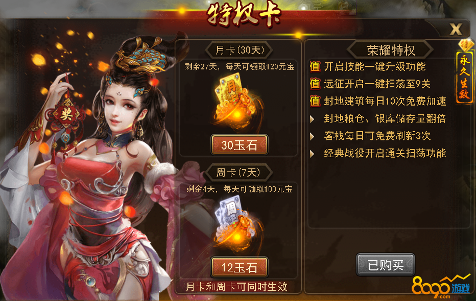 除上述之外玉石还能购买特权卡,永久生效的。特权的卡的作用有开启一键升级功能,远征活动开启一键扫荡9关,封地建筑每日10次免费加速,封地粮仓,仓库存储量翻倍,客栈每日可刷新三次,经典战役开启通关扫荡功能。