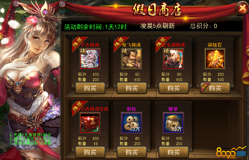 还在发愁得不到12资质武将么?快来参加积分假日商店活动吧!