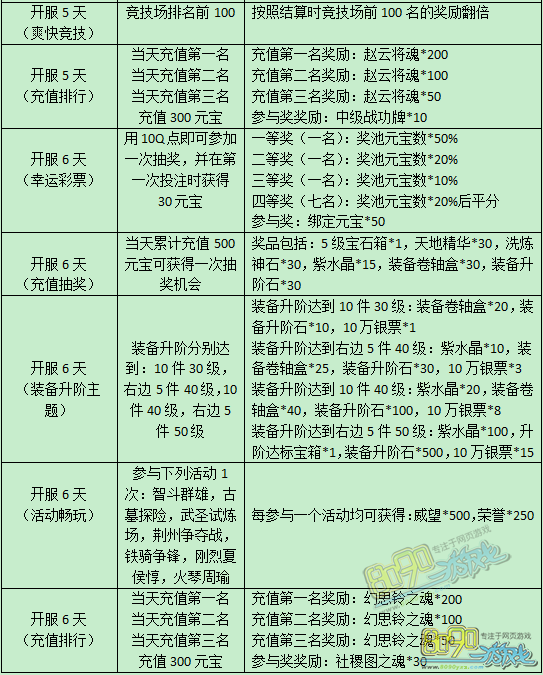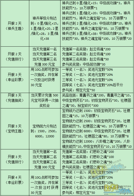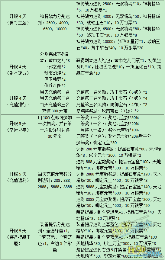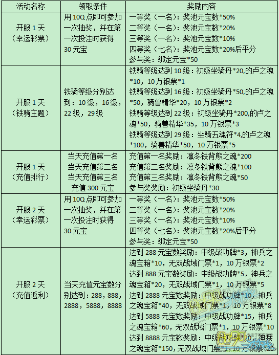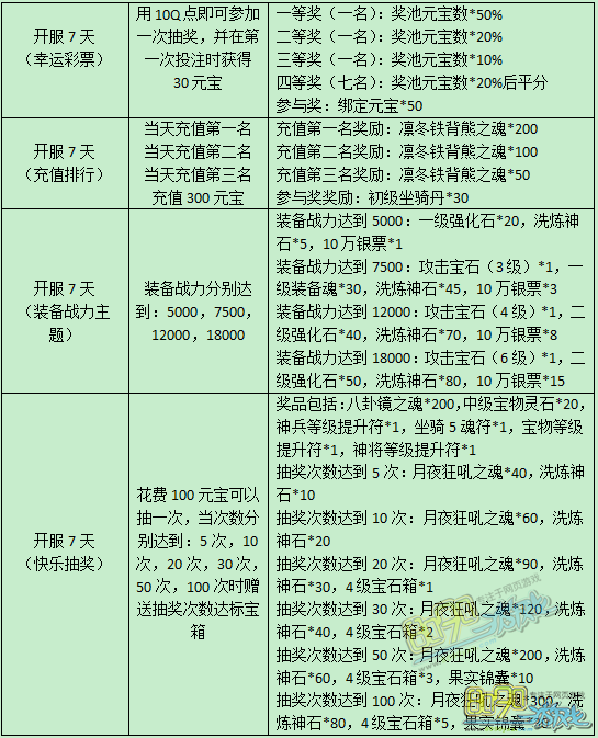 活动内容:新服开启精彩狂欢,在新服开启的前7天里,每天均有精彩活动,可获得丰厚奖励