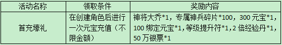 活动内容:活动期间内,只要角色第一次在游戏里进行充值,不限金额,除了能获得相应的元宝外,还可以获得“首充礼包”。