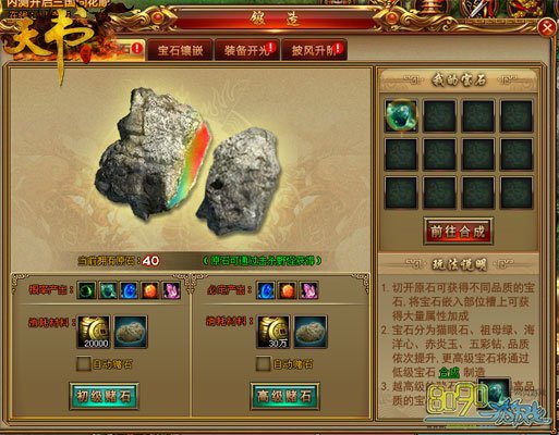 其次,新手玩家最初开通赌石系统时,建议先进性高级赌石来提升自己的战力,当拥有12颗高级宝石后,为了合成5级以上的宝石,玩家最好将使用普通赌石与高级赌石的次数比控制在8:1与10:1之间。并且优先进行普通赌石,当获得的1、2级宝石数量足够合成高级别宝石后,再开始进行高级赌石。如果一味的采用普通赌石,最后你就会发现由于4、5级宝石在普通赌石中的低爆率,会使你为合成5级以上的宝石付出更多的铜币。