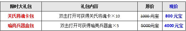 活动期间,关氏将魂卡、瑜亮兵器盒,特价道具限时上架,8折出售,一定不要错过哦!