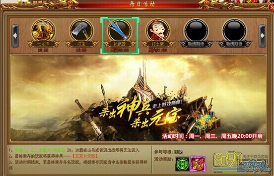 在战场上,不管是击杀NPC还是击杀玩家都可以获得积分,同时再战场里的玩家还会获得不菲的经验值。当战场结束时,如果还有不低于1个玩家存活,则存活的玩家中积分较高的玩家获得最终的胜利。在20:30后被击杀或者退出战场的玩家就无法进入战场,所以要注意时间!可别错过了。