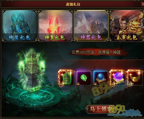 3、花费5888元宝,获得强力神器。(万仞龙渊*1,灵敏结晶小*1,高级修为丹*1,八倍经验丹一小时*1,1000绑定元宝*1)