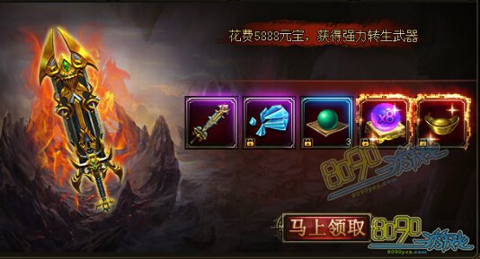 4、花费5888元宝,获得强力转生武器。(毒妖剑*1,狂暴结晶大*1,高级龙魂丹*3,八倍经验丹一小时*1,1000绑定元宝*1)