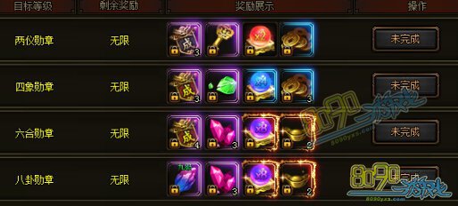 4、八卦勋章:9级强化石*1,暴戾结晶大*3,八倍经验丹一小时*1,500绑定元宝*2