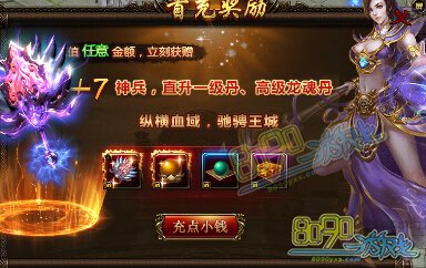 活动奖励:+7神兵武器*1,80级升级丹*1,高级龙魂丹*1,首充大礼包*1(狂暴结晶(大)*1,7级强化石*1,100万铜钱*1)