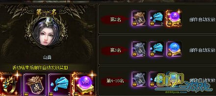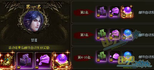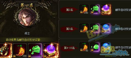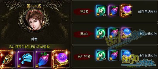 活动奖励:第1名,车骑将军戒指*1,中级成就令牌*1,狂暴结晶大*2,八倍经验丹三小时*1