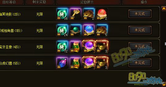 3、4阶:坐骑经验丹低级*72,50%幸运符*1,八倍经验丹三小时*1,1000绑定元宝*3