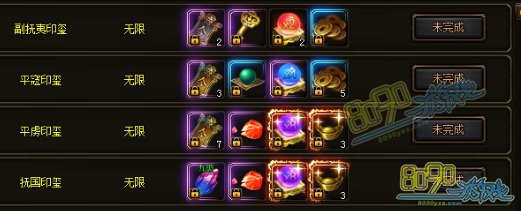 4、抚国印玺:9级强化石*1,暴怒结晶中*1,1000绑定元宝*3,八倍经验丹三小时*1
