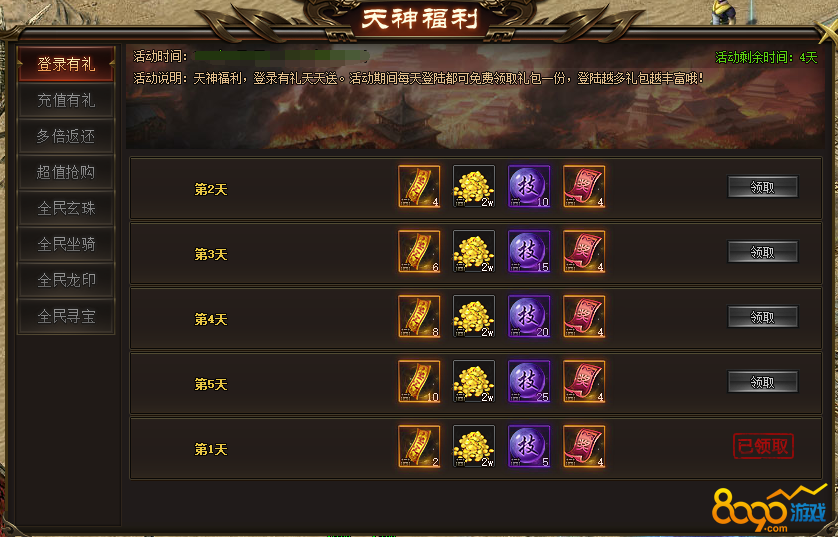 活动说明: 天神福利,登录有礼天天送。活动期间每天登陆都可免费领取礼包一份,登陆越多礼包越丰富哦!