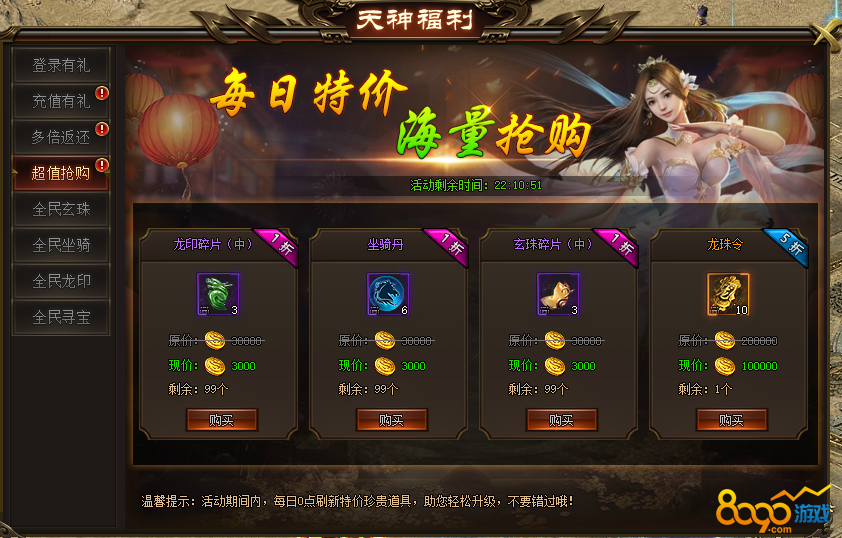 活动说明:活动期间内,每日0点刷新特价珍贵道具,助您轻松升级,不要错过哦!