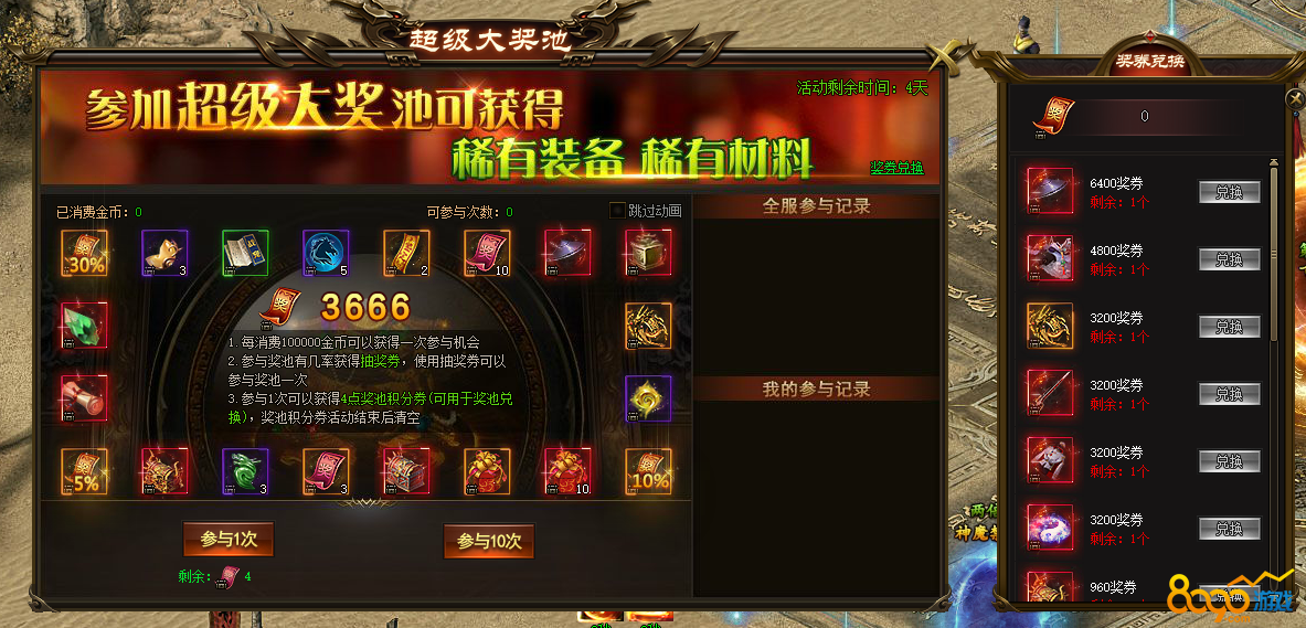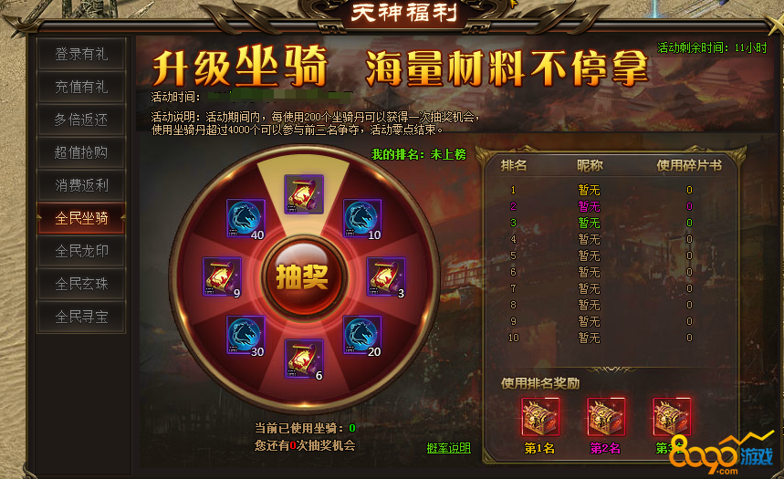 活动说明:活动期间内,每使用200个坐骑丹可以获得一次抽奖机会,
