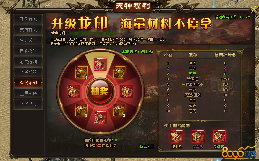 活动说明:活动期间内,使用龙印材料获得1000积分可获得一次抽奖机会,