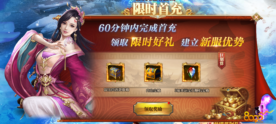 活动说明:60分钟内完成首充,可领取限时首充奖励,建立新服优势