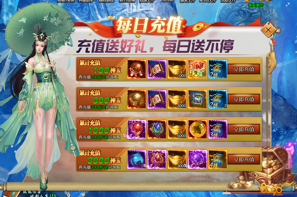 活动说明:每天充值不同档次的仙玉可以领取超值奖励。