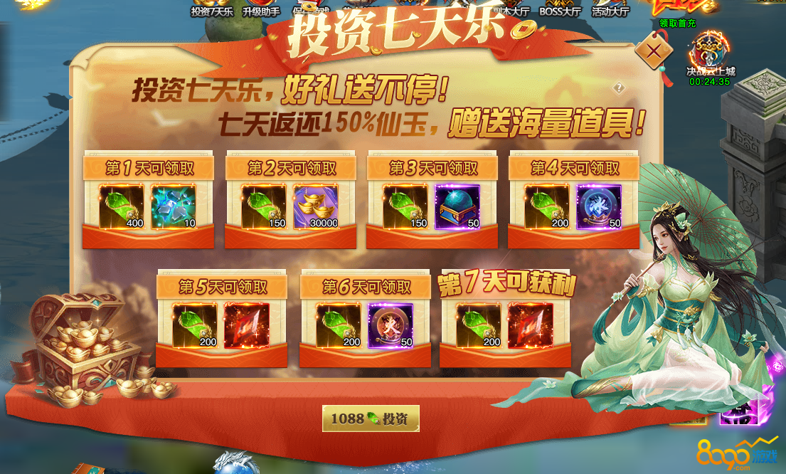 活动说明:消耗仙玉投资,七天共返还150%仙玉及海量额外奖励。