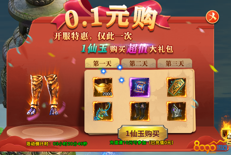 活动说明:开服第一天特殊活动,只需花费1仙玉即可购买超值好礼,连领3天奖励。