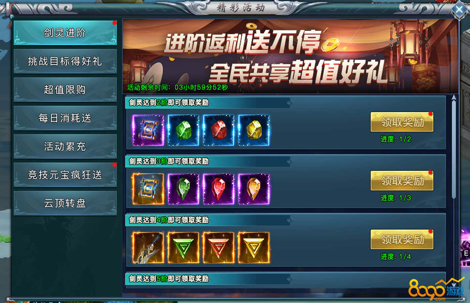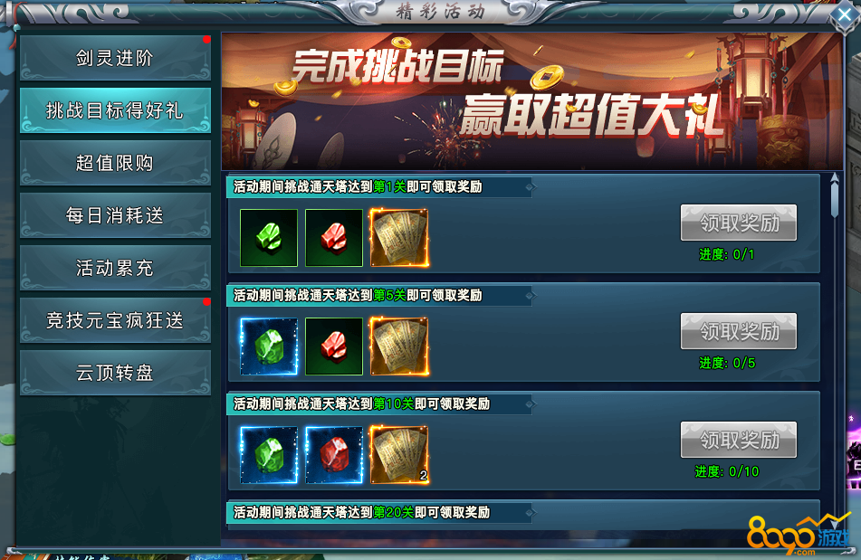 挑战目标特好礼:完成不同挑战目标领取不同奖励。