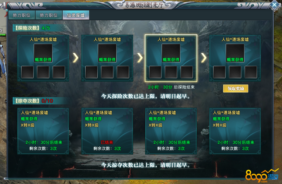每次探险有一次免费刷新次数,几率提升探险的道场等级