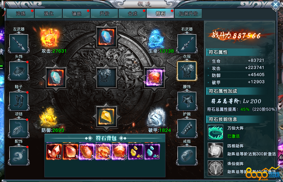 镶嵌符石等级达到200,300,400级分别可激活万仙大阵,四相劫阵,诛仙剑阵,可带来不同的属性加成
