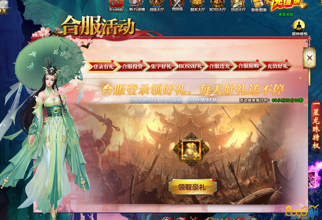 BOSS好礼:合服活动的前3天,神级BOSS,禁地BOSS,圣域BOSS,仙位BOSS掉落道具额外增加50%