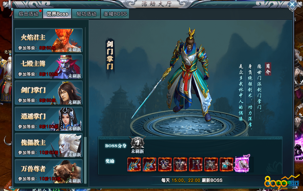 世界BOSS为跨服活动,每天定时开放,成功挑战BOSS可获得高阶装备和侠客卡。