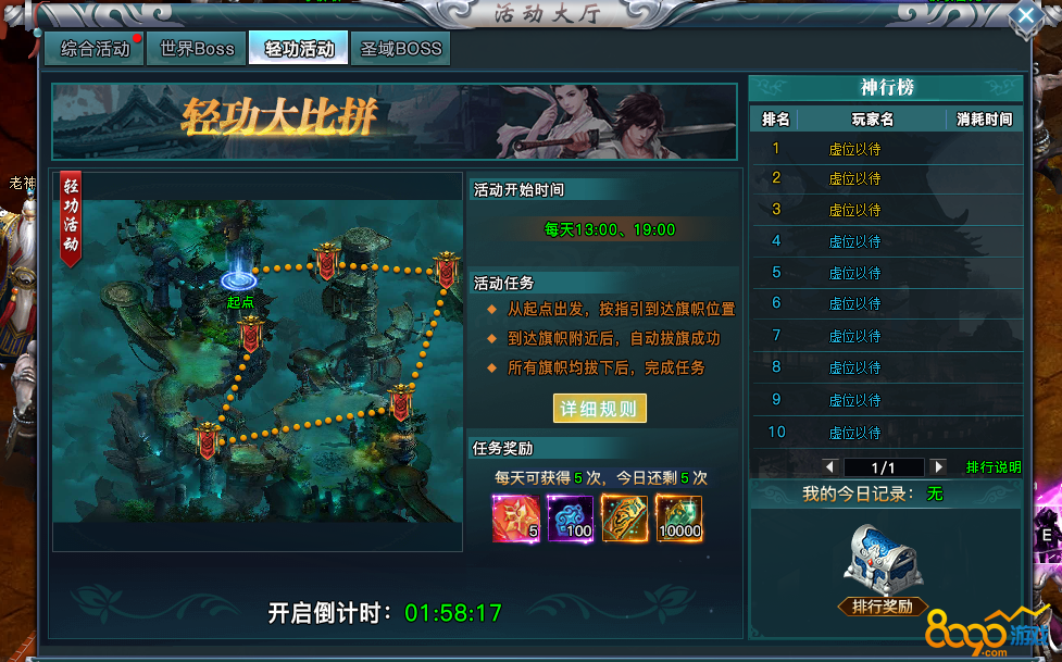 轻功活动每天定时开启,玩家通过使用轻功到达指定区域,用时最短者即可神行榜中领取奖励。