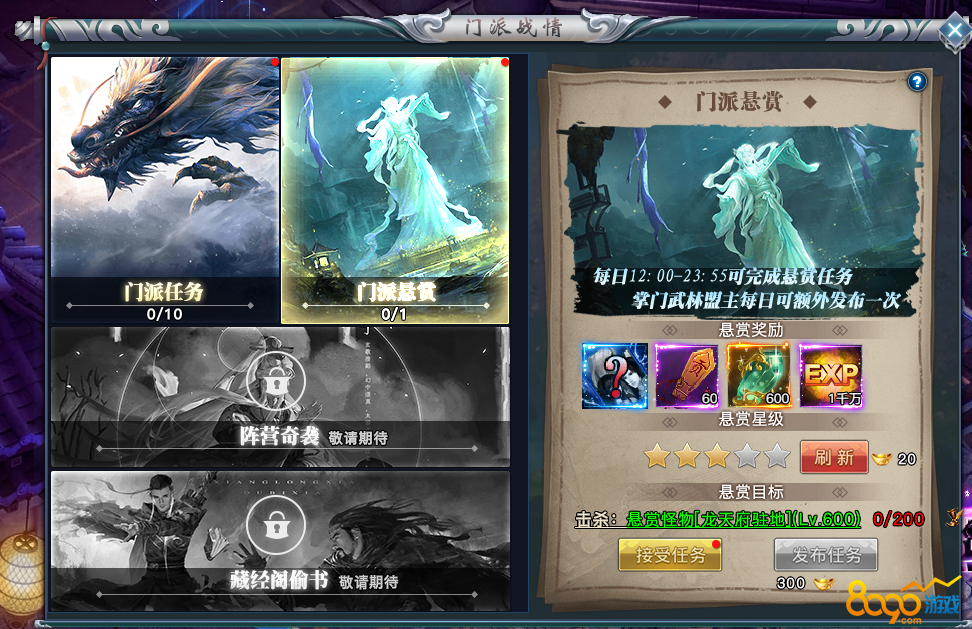 每天可完成一次悬赏任务,掌门和武林盟主可额外发布一次悬赏任务