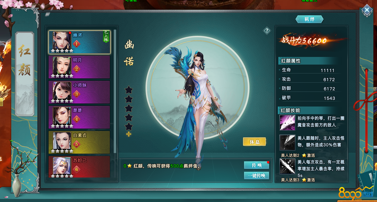 美人激活后可进行传召,传召后获得羁绊值,消耗羁绊值可提升美人羁绊,提升主角各项属性